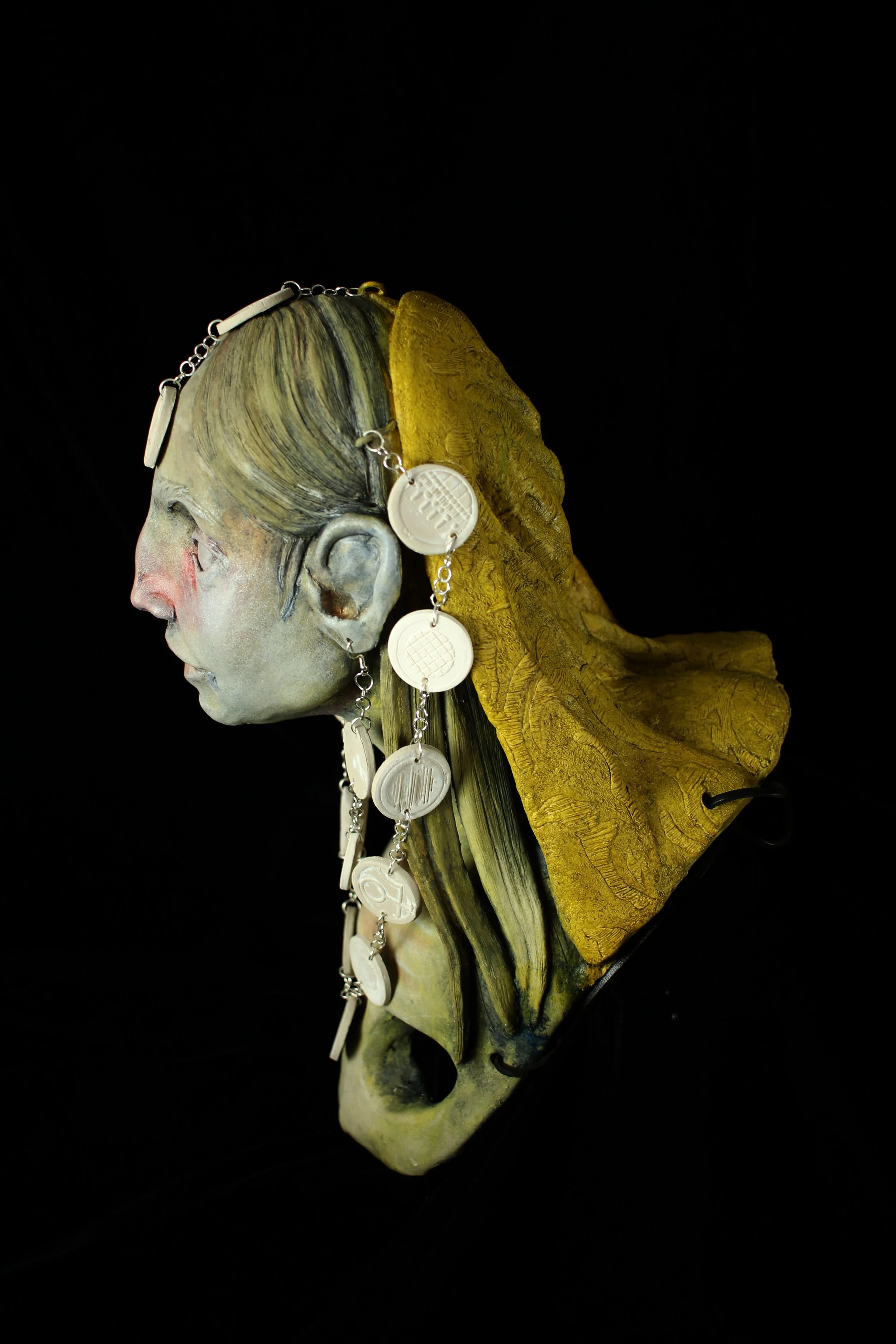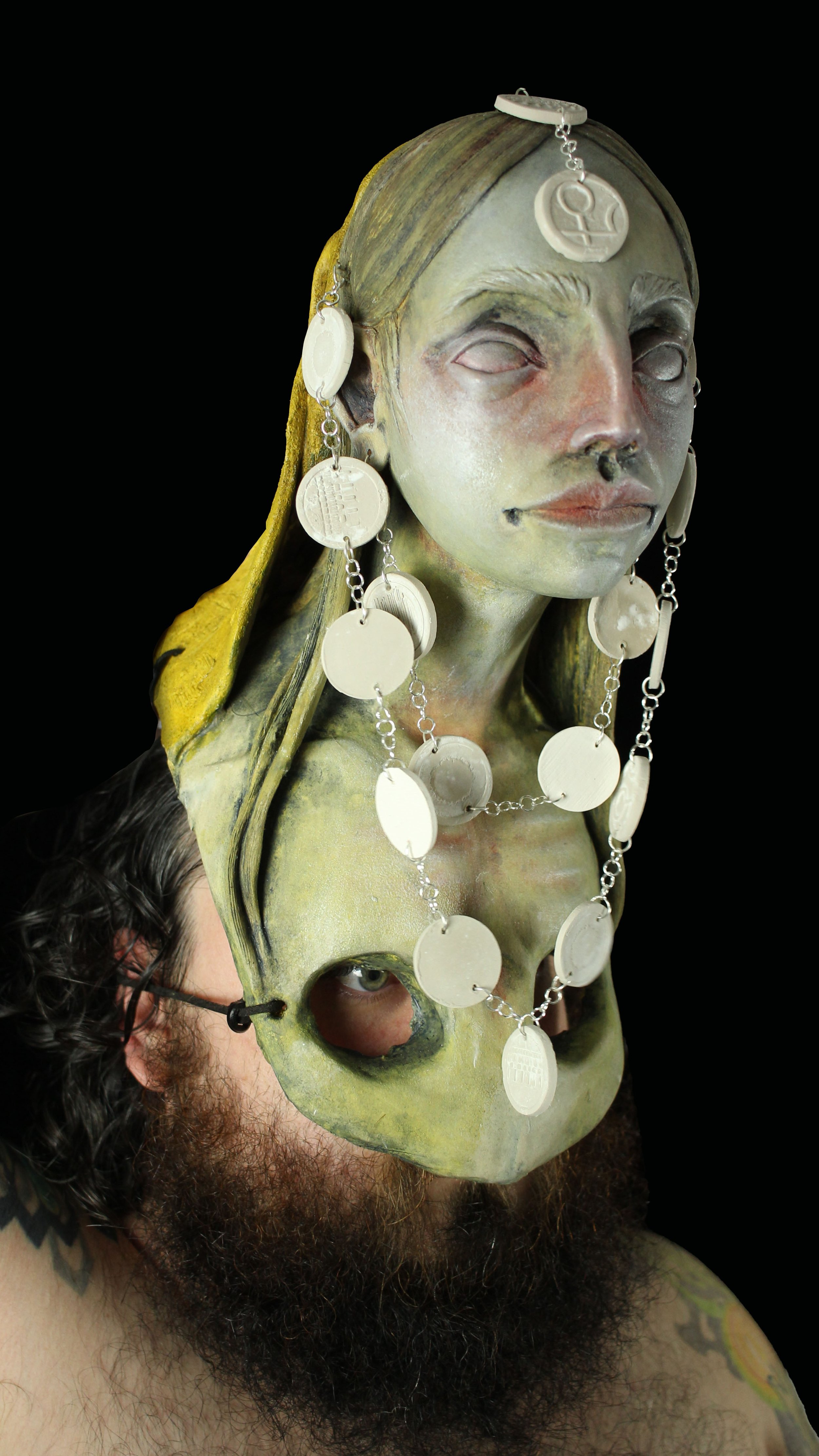 The mask was hand sculpted, referencing classically considered idealized proportions associated with male beauty standards, and then a portrait was projected and painted onto the mask, selected to represent features I would have considered the ideal of male beauty growing up. It is within the mis-alignment of the portrait and the sculpted features, that leads to its otherwise unsettling presence.