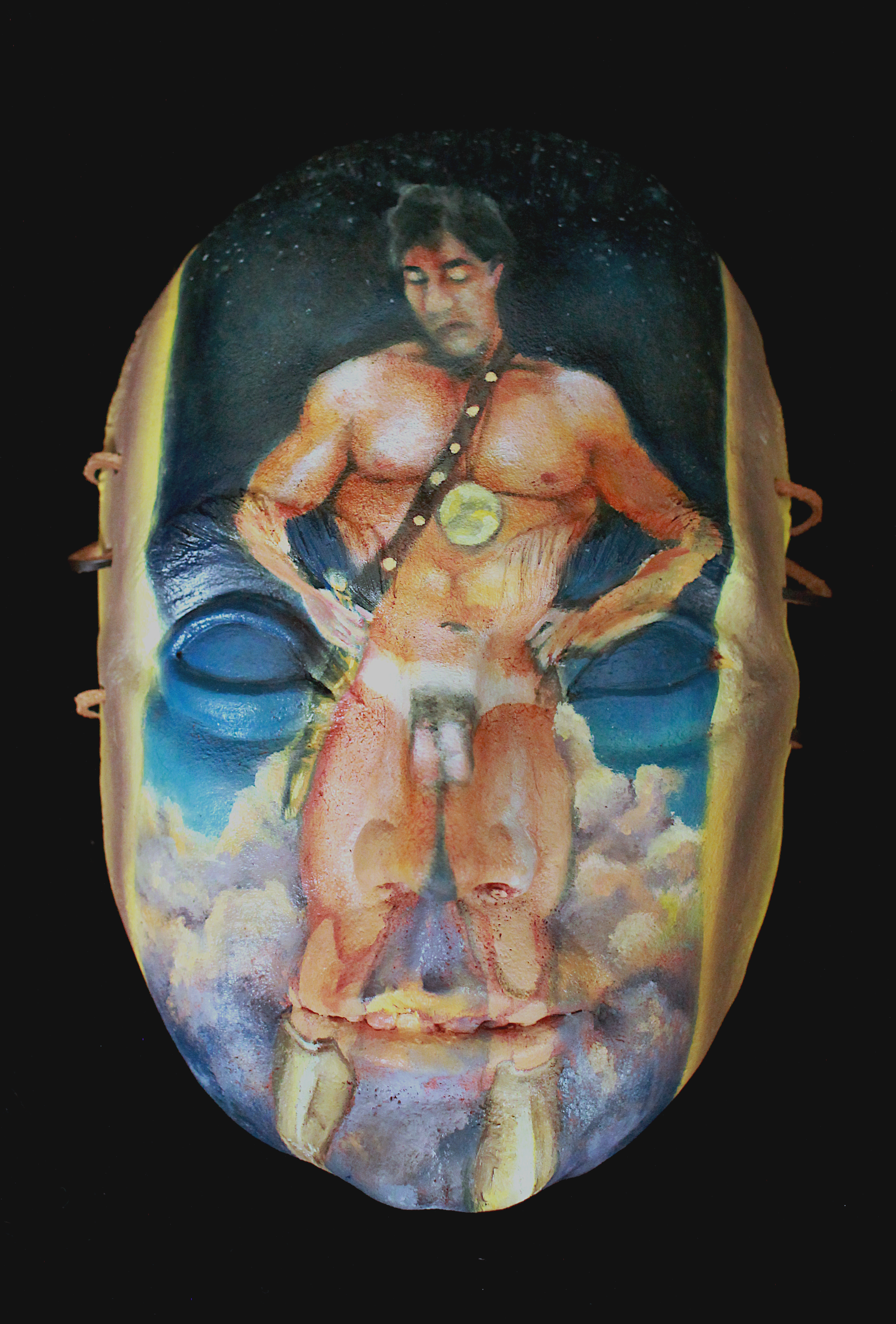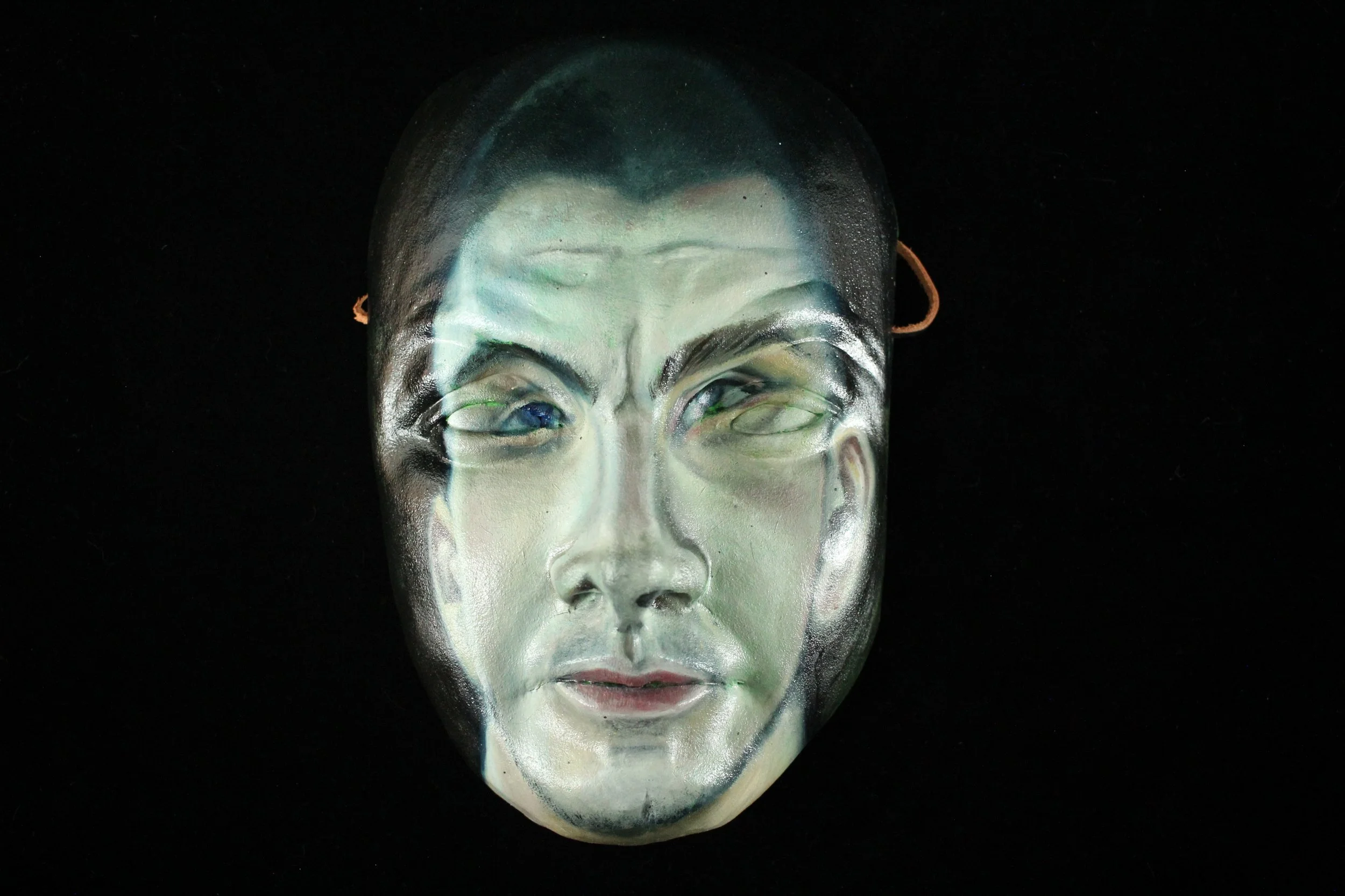 Oil paint on stoneware mask, leather straps