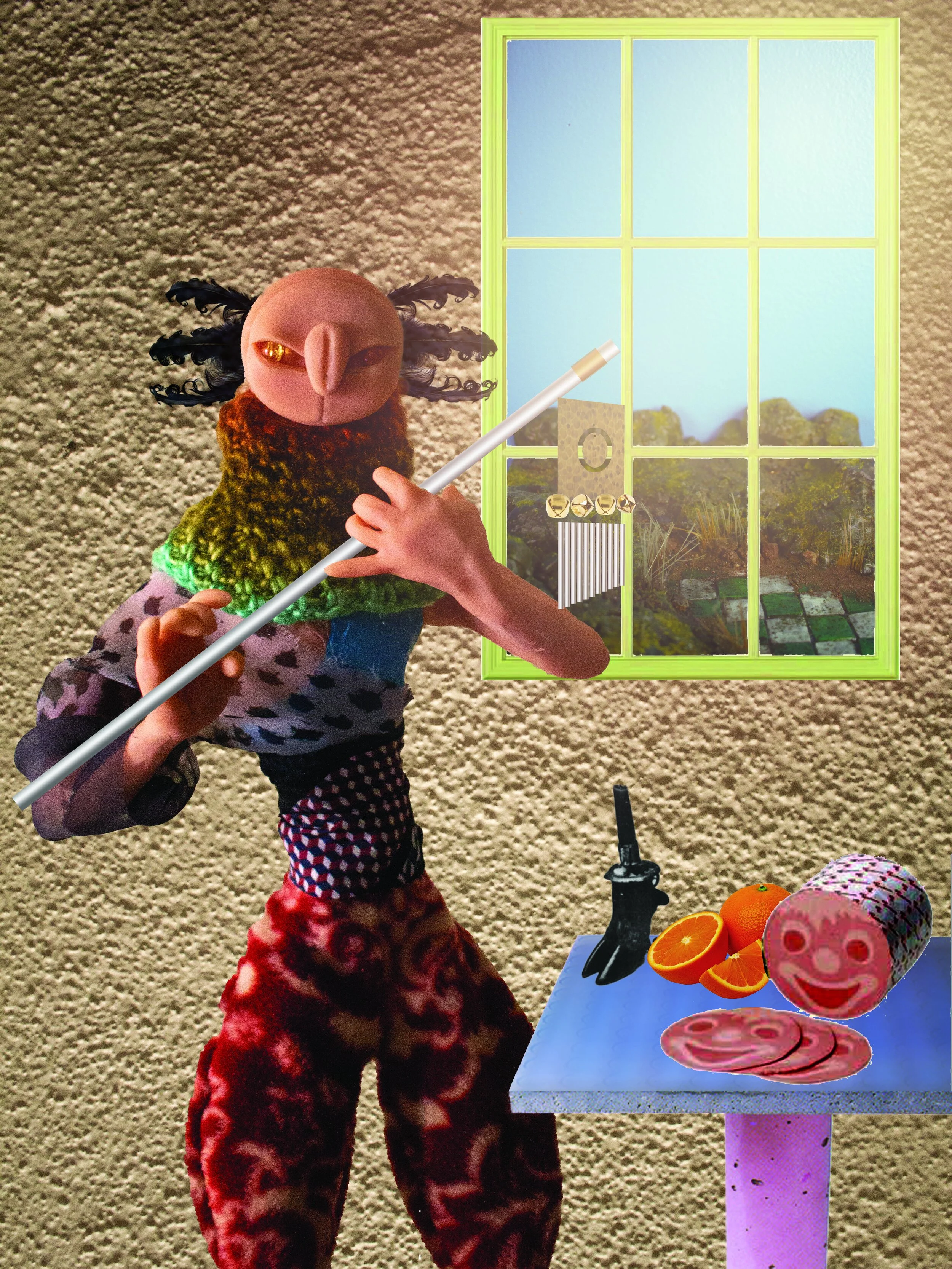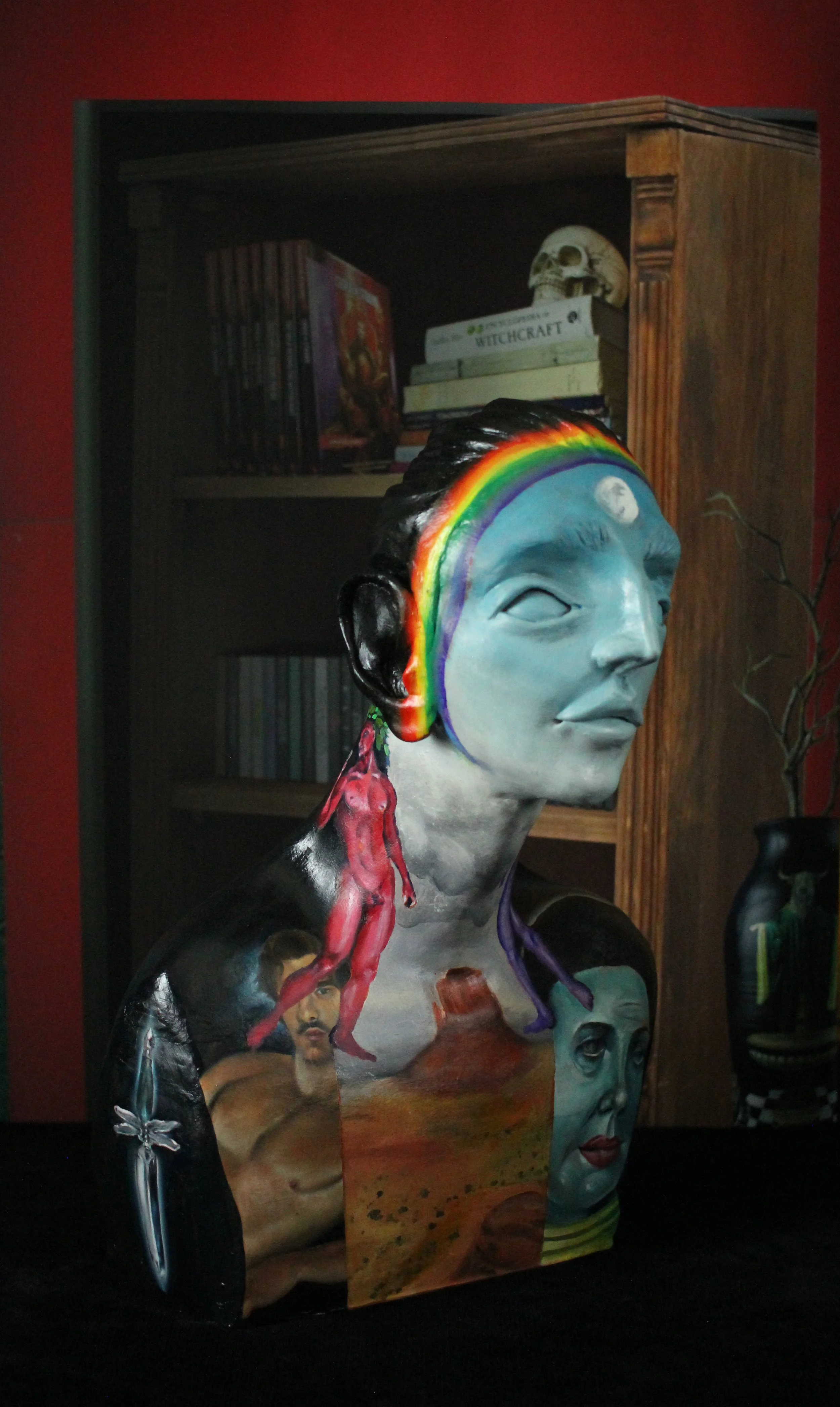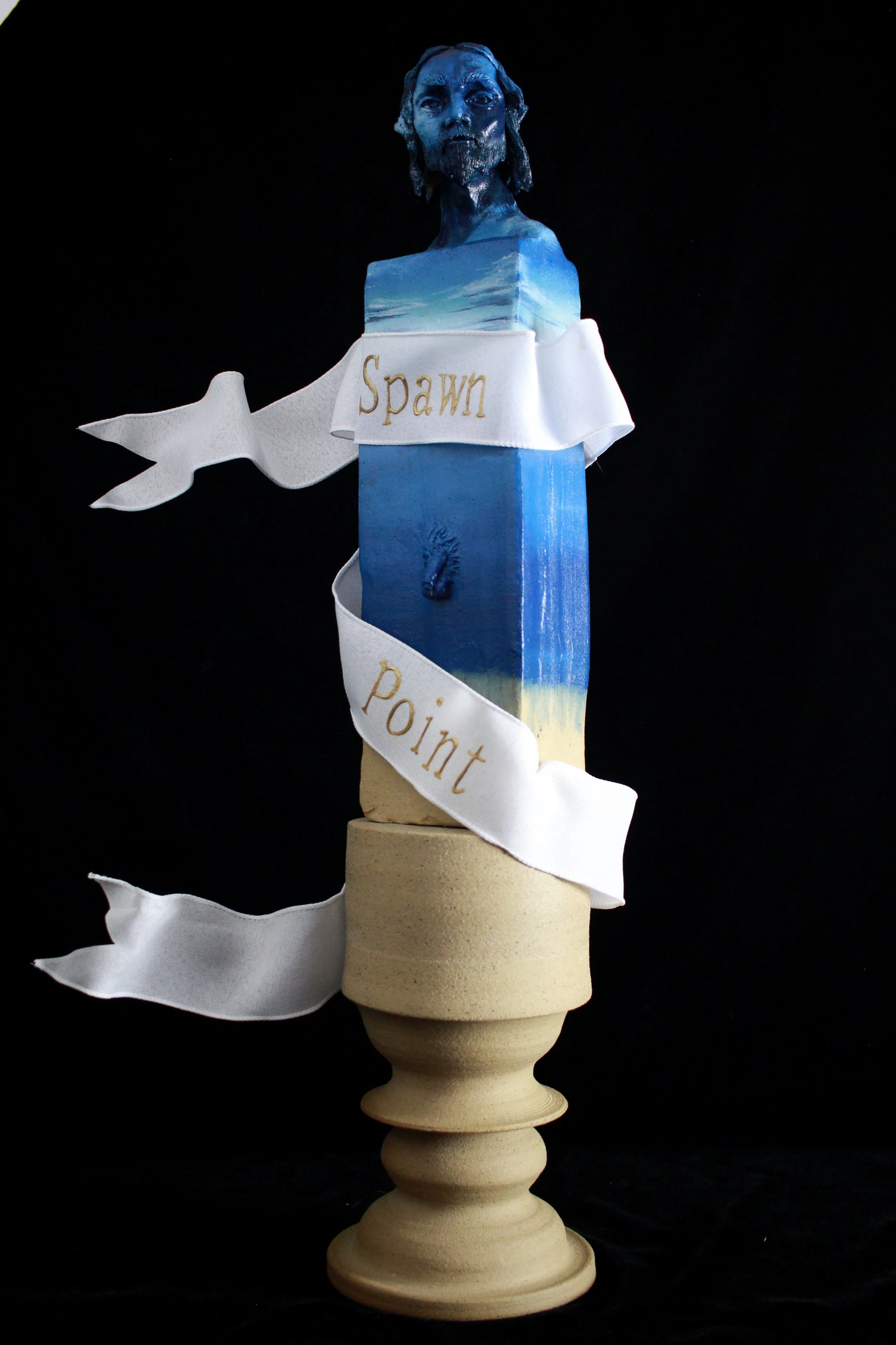 Oil paint on Glazed Stoneware, Glazed stoneware beads and bottles, dyed sisal rope, acrylic yarn, embroidery floss, silver beads, cypress branch, feather, dryed grass, dirt, severed toe