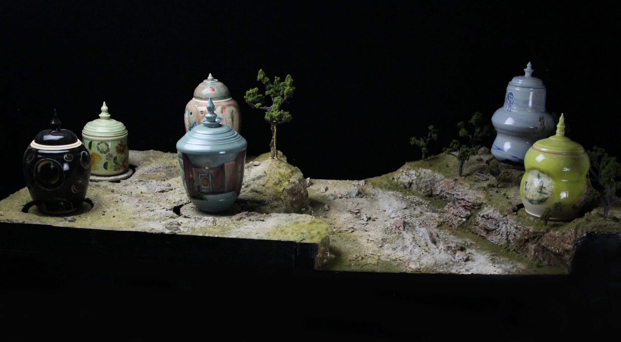 Glazed stoneware and porcelain Jars, MDF, polystyrene foam, plaster, crossroads dirt, grout, gravel, acrylic paint, flocking, static grass, scale model trees, aluminum wire, rotating display stands.