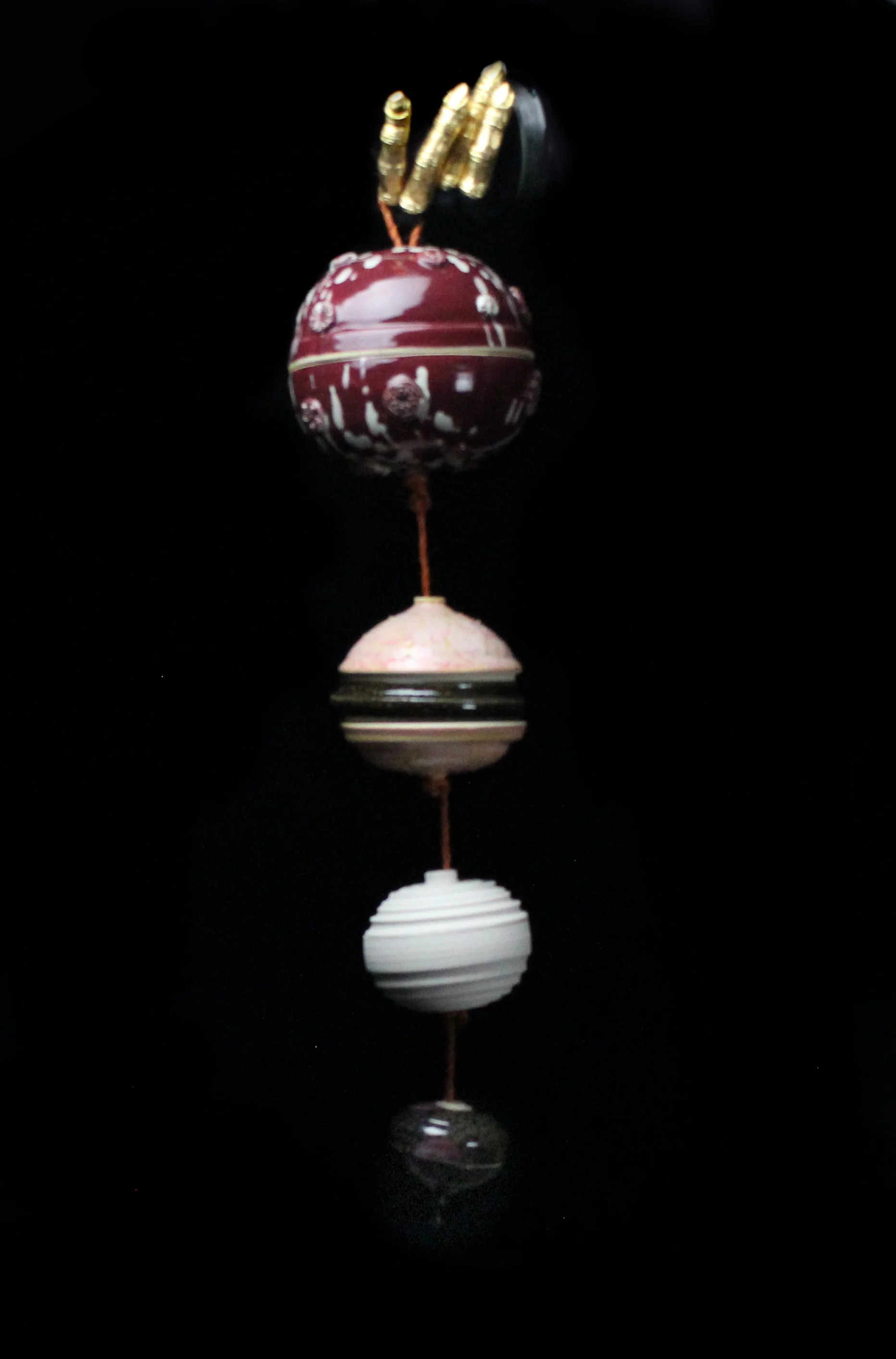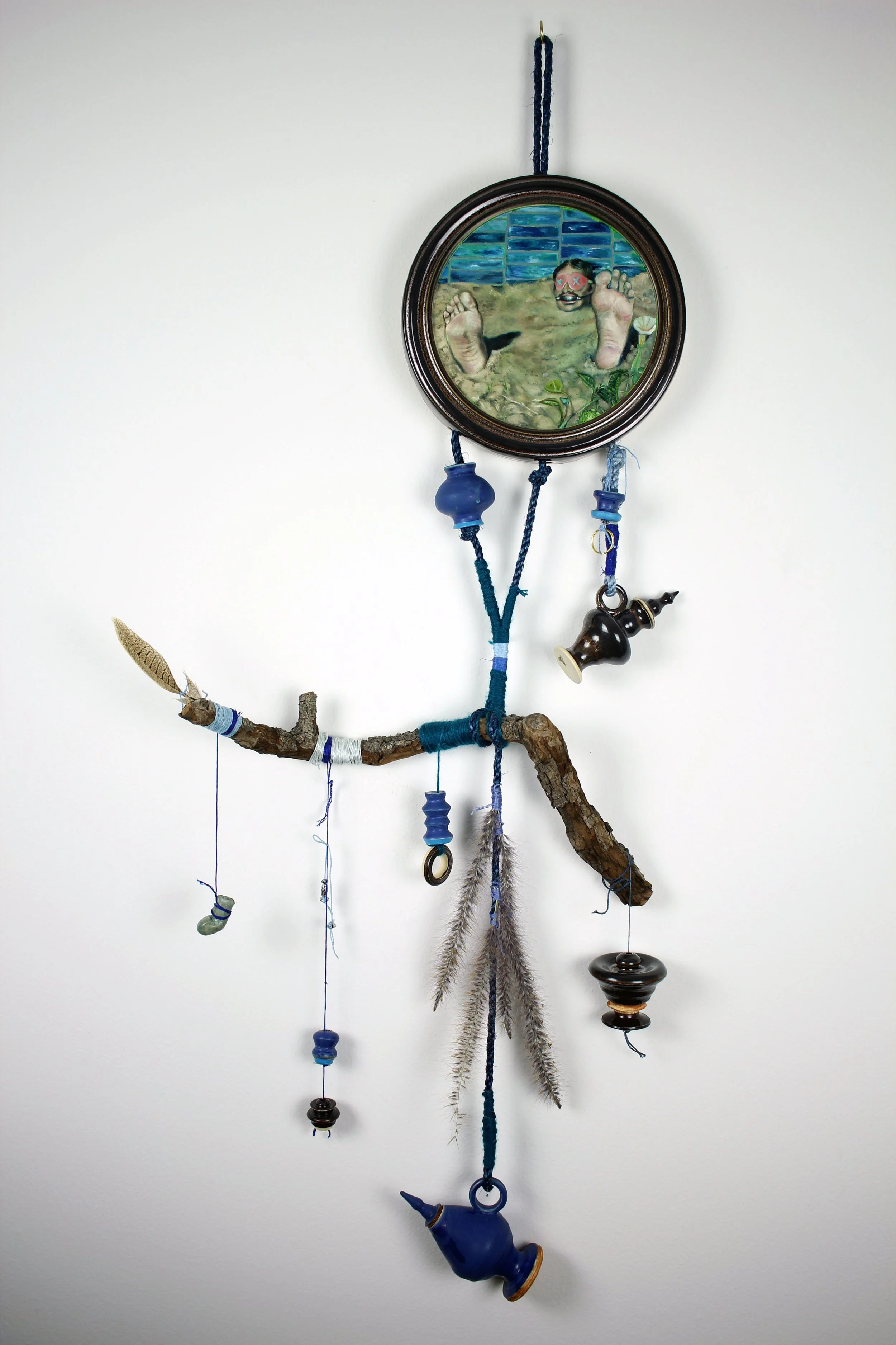 Oil paint on Glazed Stoneware, Glazed stoneware beads and bottles, dyed sisal rope, acrylic yarn, embroidery floss, silver beads, cypress branch, feather, dryed grass, dirt, severed toe